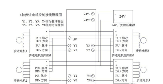 兩軸接線服電機(jī)法要注意步進(jìn)電機(jī)驅(qū)動(dòng)器1中pu+脈沖和dr+方向連接是步進(jìn)電機(jī)2中pu+脈沖和dr+方向,其中步進(jìn)機(jī)1中pu+脈沖還連接著5v。