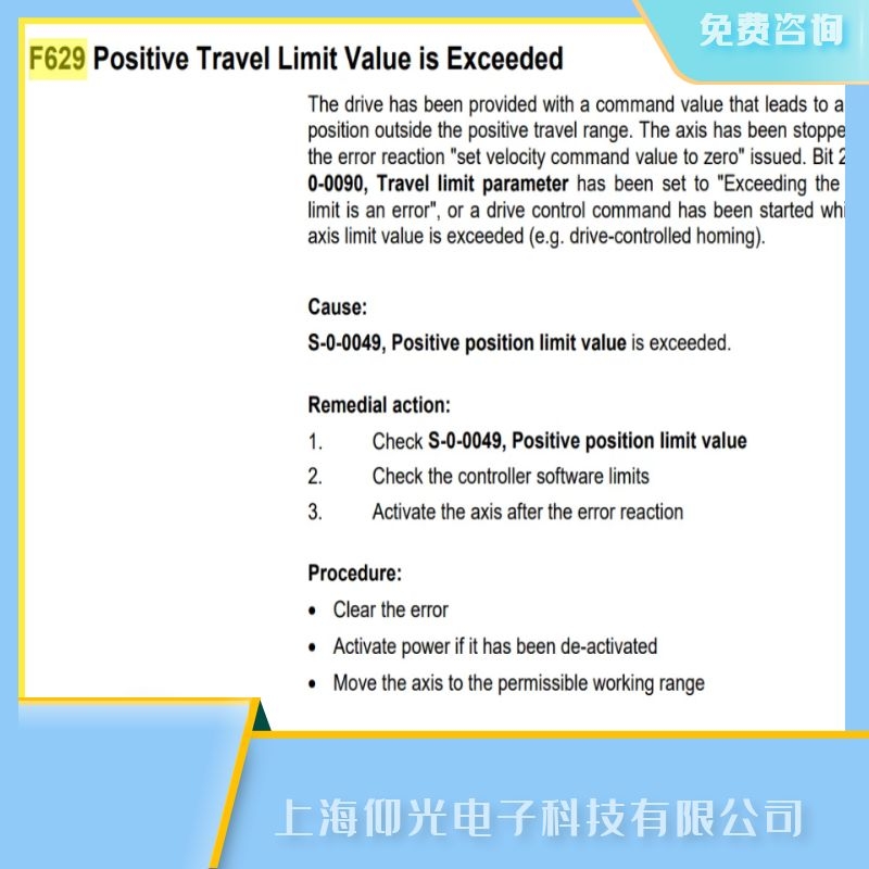 上海仰光電子科技有限公司工程師整合的關于寧波力士樂伺服驅動器維修,力士樂伺服放大器顯示屏不亮維修,力士樂伺服驅動器維修,力士樂伺服放大器維修,力士樂伺服控制器維修,力士樂伺服箱維修,力士樂伺服系統維修,力士樂放大器維修,Rexroth力士樂報F629維修解析,力士樂伺服維修,力士樂電源維修,力士樂伺服電機維修,力士樂伺服馬達維修,力士樂觸摸屏維修等以及其它品牌工控產品維修方法,維修故障代碼解析,維修案例能快速幫你解決一部分簡單故障,無論任何品牌的工控產品由于環境惡劣,操作不當,使用年限等原因,難免會出現故障,最重要的是及時查找出原因,對應解決故障,及早恢復正常使用上海仰光面向全國,支持順豐到付,擁有全套測試平臺,軟硬件結合,帶載運行,維修速度快,價格低,免費檢測,修好測試后發出,部分當天修好,修不好不收費用,免費咨詢:13817011982張工.關于寧波Rexroth力士樂伺服驅動器維修,伺服放大器F629超出正行程故障維修解析的技術問題上海仰光電子提供24小時免費咨詢服務.